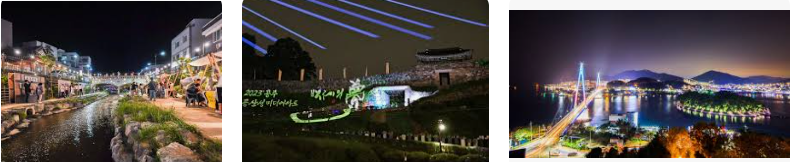 공주 페스티벌의 가장 큰 매력 중 하나는 제민천을 따라 조성된 야간 산책 코스입니다. ‘감영길’로 불리는 이 산책로는 평소에도 공주시민이 즐겨 찾는 장소이지만, 페스티벌 기간에는 전혀 다른 세계로 변모합니다. 천을 따라 이어지는 구간 전체에 다양한 조명과 미디어아트 장치들이 설치되어 어둠을 밝히며 환상적인 분위기를 연출합니다.