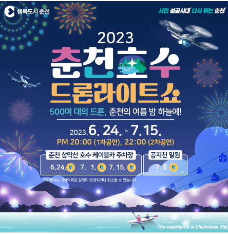 매년 여름, 춘천 밤하늘을 수놓는 드론쇼는 가족 여행의 하이라이트! 음악, 조명, 드론 퍼포먼스가 어우러진 환상적인 공연이에요.