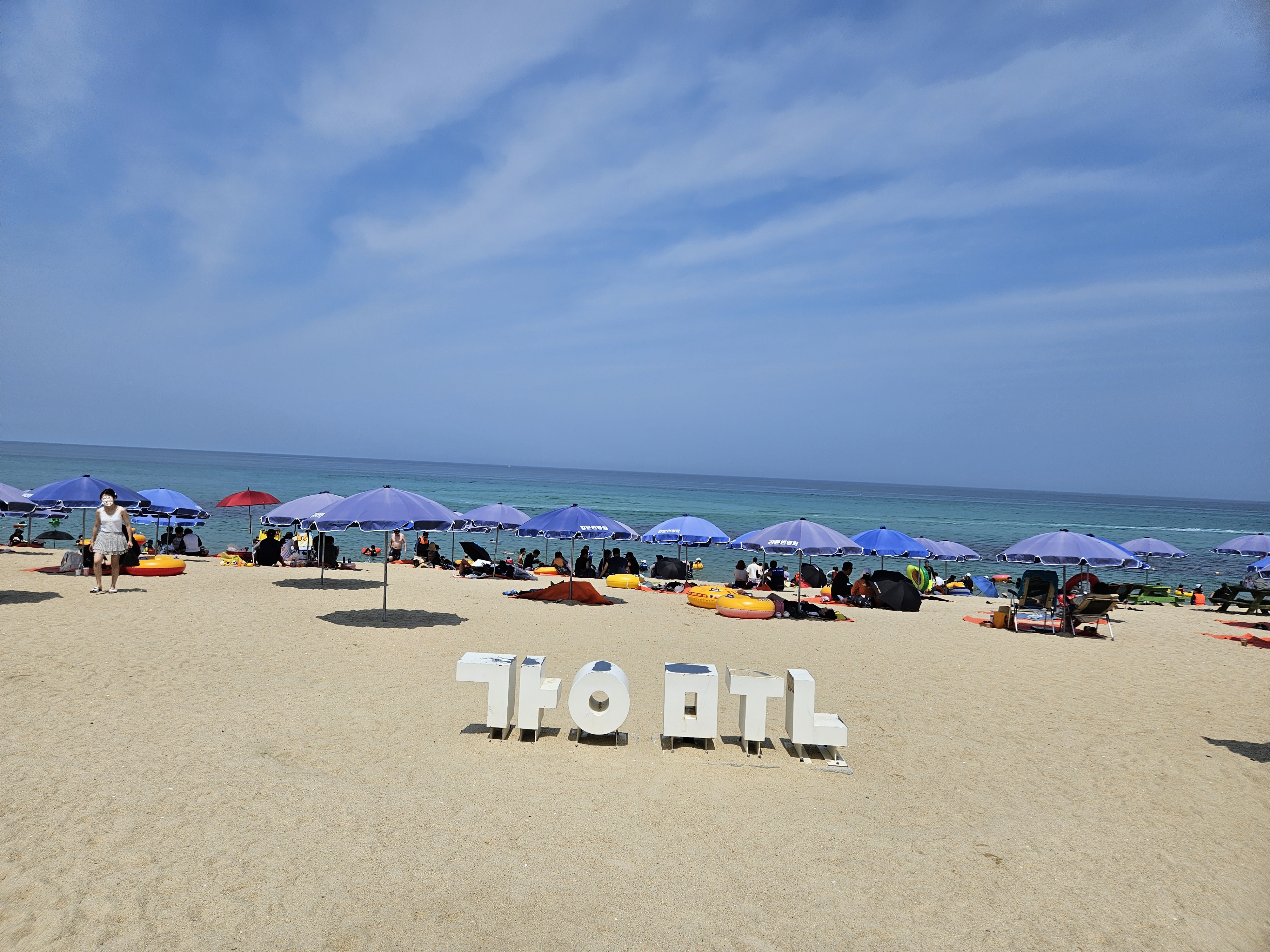 - 강문해변 간판 포토존 – ‘강문해변’ 조형물과 바다 배경 조합