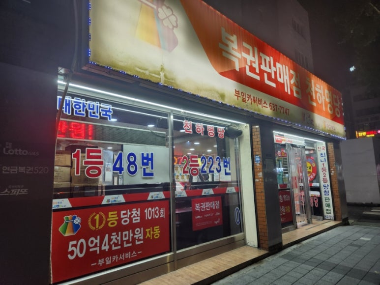 - 부산 연산동 부일카서비스: 무려 1등 당첨 50회, 전국 최다 기록 보유! 평일에도 줄 서서 복권을 사는 진풍경. 인근 온천천 카페거리에서 여유를 즐기며 운세 체크까지 함께 하자.
